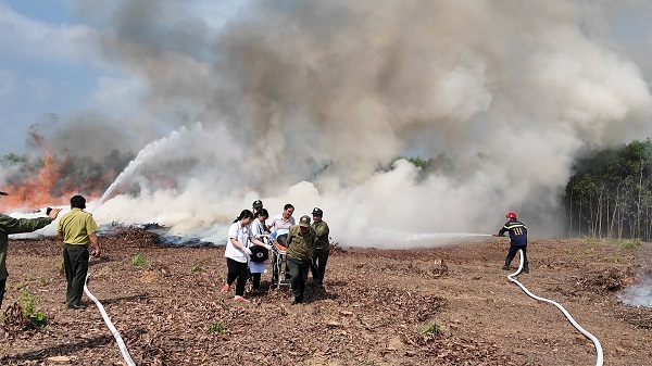 Lực lượng chữa cháy tại chỗ và người dân chủ động chữa cháy bằng các dụng cụ tại chỗ như cành cây, cuốc, rựa… đồng thời báo cáo về Ban chỉ huy diễn tập bằng máy bộ đàm. Tình huống giả định thứ 02 do tình hình thời tiết khô hanh, vật liệu cháy nhiều, ngọn lửa bốc cao ngoài tầm kiểm soát của lực lượng thủ công. Lúc này đám cháy phát triển mạnh. Lực lượng chữa cháy hiện trường tiếp tục chữa cháy, đồng thời thông báo về Ban chỉ huy đề nghị tăng cường lực lượng. Ban chỉ huy đã điều động đội chữa cháy chuyên ngành vào tham gia chữa cháy gồm 02 xe chữa cháy chuyên dụng và điều động các đội chữa cháy dùng máy bơm nước đeo vai tham gia chữa cháy trực tiếp, dùng máy thổi tạo đường băng chống cháy lan. Tình huống giả định thứ ba, khoảng 10h trong quá trình chữa cháy, có 1 người dân bị thương và được tổ y tế di chuyển ra khỏi nơi bị cháy.