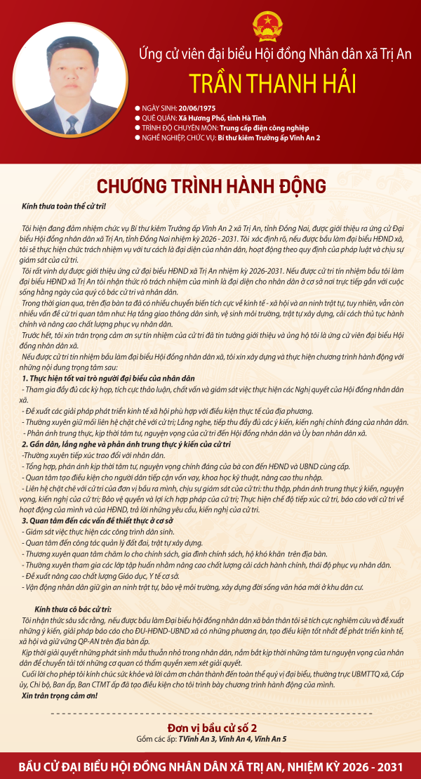 Chương trình hành động của ứng cử viên Trần Thanh Hải đại biểu HĐND xã Trị An