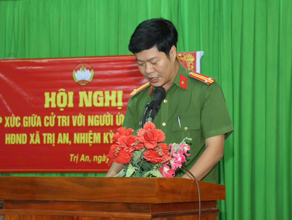 Tại hội nghị, cử tri đã được nghe báo cáo tóm tắt tiểu sử và chương trình hành động của 8 ứng cử viên, gồm: ông Nguyễn Hải Bằng – Ủy viên Ban Thường vụ Đảng ủy, Chủ tịch Ủy ban MTTQ Việt Nam xã, kiêm Trưởng Ban Kinh tế - Ngân sách HĐND xã; ông Trần Mạnh Hùng – Ủy viên Ban Thường vụ Đảng ủy xã, Trưởng Công an xã Trị An; bà Nguyễn Thị Thùy Dung – nông dân ấp Mã Đà; bà Trần Thị Huyên – Đảng ủy viên, Trưởng phòng Văn hóa - Xã hội UBND xã; ông Nguyễn Tư Khánh – Bí thư Chi bộ kiêm Trưởng ấp Vĩnh An 6; ông Nguyễn Đình Thắng – Bí thư Chi bộ kiêm Trưởng ấp Vĩnh An 7; ông Nguyễn Văn Trung – Bí thư Chi bộ kiêm Trưởng ấp Cây Sung; ông Nguyễn Minh Tuấn – Đảng ủy viên, Phó Trưởng Ban Kinh tế - Ngân sách HĐND xã.