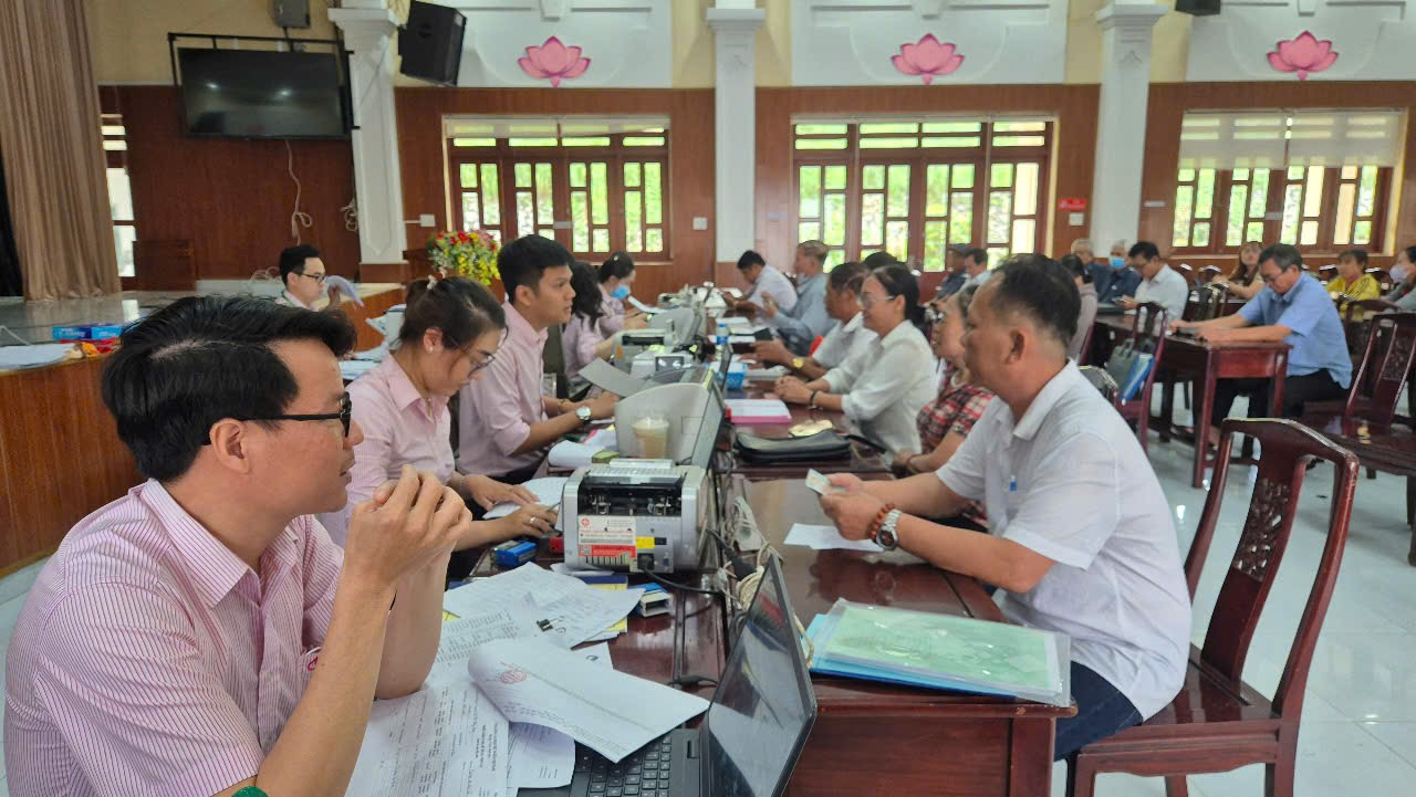 Cán bộ phòng giao dịch NHCSXH thực hiện giao dịch tại điểm giao dịch xã