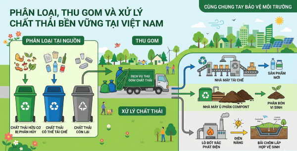 Trong công tác quản lý chất thải rắn sinh hoạt, rác thải được phân loại thành 3 nhóm gồm: chất thải có khả năng tái sử dụng, tái chế; chất thải thực phẩm; và các loại chất thải sinh hoạt khác, trong đó có chất thải nguy hại phát sinh từ hộ gia đình. Đối với chất thải công nghiệp thông thường và chất thải nguy hại, yêu cầu phải được thu gom, phân loại, vận chuyển và xử lý riêng biệt, đảm bảo đúng quy định.
