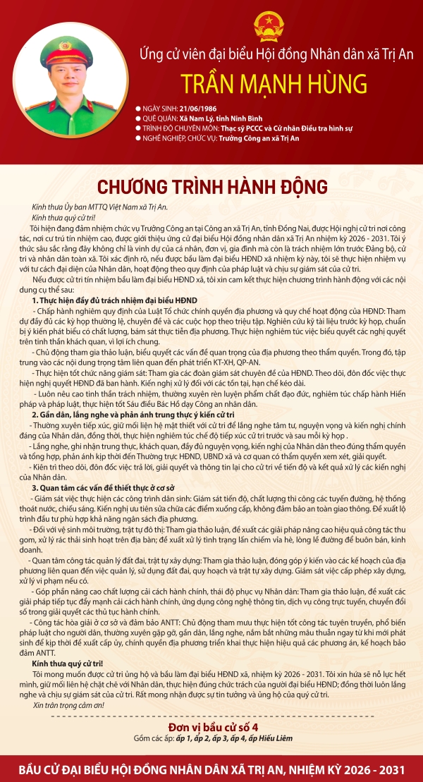 <p>Chương trình hành động của ứng cử viên Trần Mạnh Hùng đại biểu HĐND xã Trị An</p><p>Đơn vị bầu cử số 4, gồm các ấp: ấp 1, ấp 2, ấp 3, ấp 4, ấp Hiếu Liêm.</p><figure class="image"><img style="aspect-ratio:600/1109;" src="https://trian.dongnai.gov.vn/uploads/trian/news/2026_03/tran-manh-hung.jpg" width="600" height="1109" /></figure>