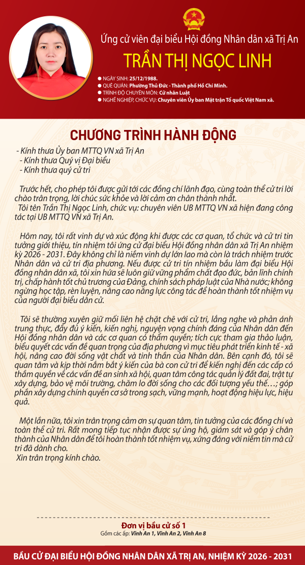 <p>Chương trình hành động của ứng cử viên Trần Thị Ngọc Linh đại biểu HĐND xã Trị An</p><p>Đơn vị bầu cử số 1, gồm các ấp: Vĩnh An 1, Vĩnh An 2 và Vĩnh An 8.</p><figure class="image"><img style="aspect-ratio:600/1109;" src="https://trian.dongnai.gov.vn/uploads/trian/news/2026_03/tran-thi-ngoc-linh.png" width="600" height="1109" /></figure>
