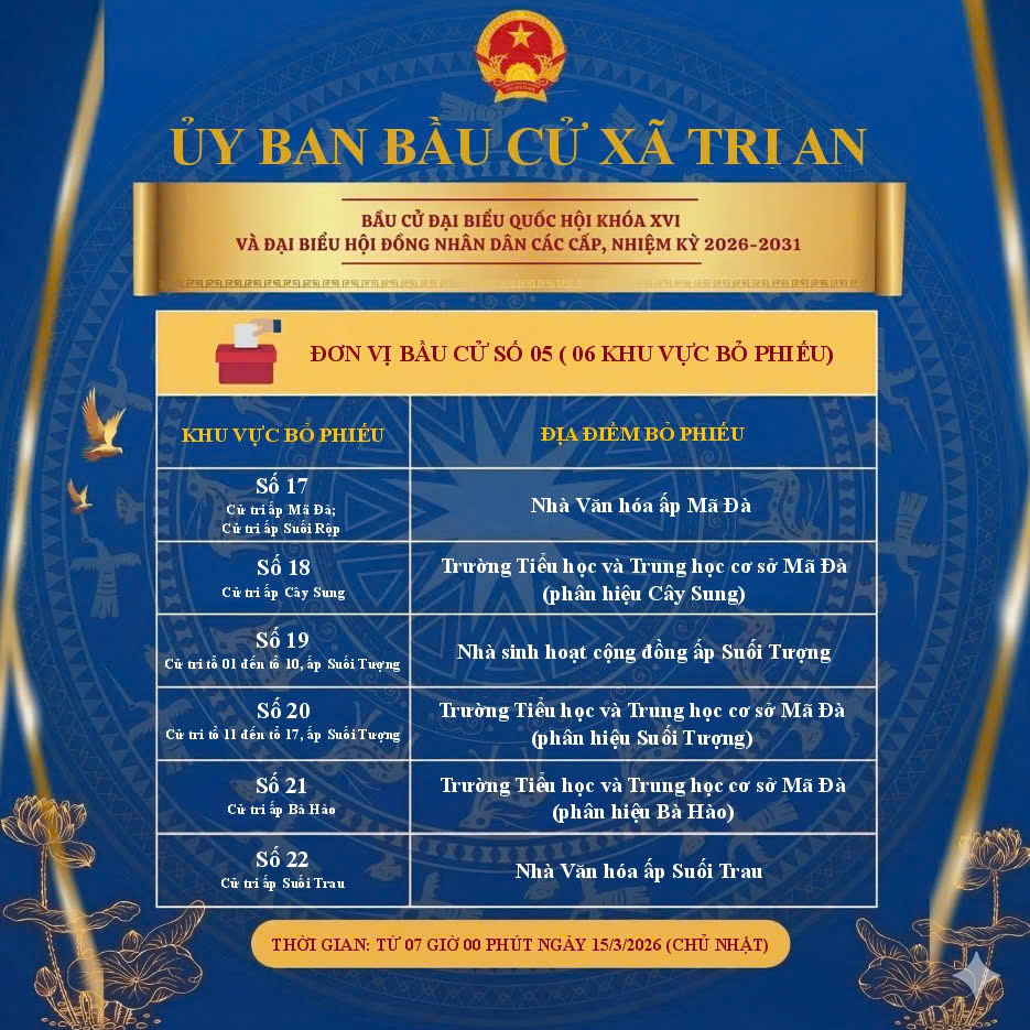 <p>Đơn vị bầu cử số 5 thuộc Ủy ban bầu cử xã Trị An phục vụ Bầu cử đại biểu Quốc hội khóa XVI &nbsp;và đại biểu HĐND các cấp nhiệm kỳ 2026 – 2031</p><figure class="image"><img style="aspect-ratio:935/935;" src="https://trian.dongnai.gov.vn/uploads/trian/news/2026_03/1_2.jpg" width="935" height="935" /></figure><p>&nbsp;</p>