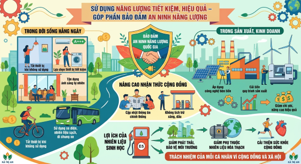<p style="text-align:justify;">Sử dụng năng lượng tiết kiệm, hiệu quả cần bắt đầu từ những hành động nhỏ trong đời sống hằng ngày. Người dân nên chủ động điều chỉnh thói quen sinh hoạt như tắt các thiết bị điện khi không sử dụng, lựa chọn thiết bị tiết kiệm điện, tận dụng ánh sáng và thông gió tự nhiên. Trong đi lại, khuyến khích sử dụng phương tiện giao thông công cộng, phương tiện sử dụng điện, nhiên liệu sạch hoặc đi chung xe để giảm tiêu thụ xăng, dầu.</p><figure class="image"><img style="aspect-ratio:600/327;" src="https://trian.dongnai.gov.vn/uploads/trian/news/2026_04/9.4.2026-tiet-kiem-nang-luong.png" width="600" height="327" /></figure><p style="text-align:justify;">Đối với các cơ sở sản xuất, kinh doanh, việc áp dụng công nghệ tiên tiến, cải tiến quy trình sản xuất nhằm tiết kiệm năng lượng, giảm chi phí đầu vào là giải pháp thiết thực và bền vững. Đồng thời, cần nâng cao ý thức sử dụng năng lượng hợp lý, tránh lãng phí, góp phần nâng cao hiệu quả sản xuất, kinh doanh.</p><p style="text-align:justify;">Bên cạnh đó, việc sử dụng nhiên liệu sinh học mang lại nhiều lợi ích thiết thực. Về môi trường, nhiên liệu sinh học giúp giảm phát thải khí nhà kính, hạn chế ô nhiễm không khí do có hàm lượng lưu huỳnh thấp hơn so với nhiên liệu truyền thống. Về kinh tế, việc phát triển và sử dụng nhiên liệu sinh học góp phần giảm phụ thuộc vào nguồn nhiên liệu hóa thạch nhập khẩu, thúc đẩy phát triển nông nghiệp và công nghiệp chế biến trong nước. Đối với sức khỏe cộng đồng, việc giảm khí thải độc hại từ phương tiện giao thông giúp cải thiện chất lượng không khí, hạn chế các bệnh về hô hấp và tim mạch.</p><p style="text-align:justify;">Hiện nay, việc áp dụng nhiên liệu sinh học đã được triển khai theo lộ trình cụ thể của Chính phủ, trong đó xăng sinh học (như E5) được phối trộn giữa xăng khoáng và ethanol nhằm giảm lượng phát thải, bảo vệ môi trường. Việc sử dụng xăng sinh học theo quy định không chỉ góp phần thực hiện mục tiêu phát triển bền vững mà còn phù hợp với xu hướng sử dụng năng lượng sạch, thân thiện với môi trường.</p><p style="text-align:justify;">Mỗi người dân cần nâng cao nhận thức, chủ động cập nhật thông tin chính thống về tình hình năng lượng, không hoang mang trước những biến động giá cả, không thực hiện hành vi tích trữ xăng, dầu gây ảnh hưởng đến thị trường. Việc sử dụng năng lượng tiết kiệm, hiệu quả gắn với ưu tiên sử dụng nhiên liệu sạch là trách nhiệm của mỗi cá nhân đối với cộng đồng và xã hội.</p><p style="text-align:justify;">Đảng ủy và UBND xã Trị An đã và đang triển khai đồng bộ các giải pháp nhằm tuyên truyền, vận động Nhân dân sử dụng năng lượng tiết kiệm, hiệu quả; tăng cường thông tin kịp thời, chính xác về tình hình thị trường xăng dầu; đồng thời phối hợp kiểm tra, giám sát, góp phần bảo đảm nguồn cung ổn định, không để xảy ra tình trạng khan hiếm, đầu cơ, găm hàng. Qua đó, góp phần ổn định đời sống Nhân dân, giữ vững an ninh năng lượng và phát triển kinh tế - xã hội trên địa bàn./.</p>