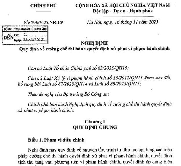 Chính phủ vừa ban hành Nghị định 296/2025/NĐ-CP ngày 16/11/2025 quy định về cưỡng chế thi hành quyết định xử phạt vi phạm hành chính. Nghị định có hiệu lực từ ngày 01/01/2026, trong đó nêu rõ tỷ lệ khấu trừ một phần lương hoặc thu nhập đối với cá nhân bị áp dụng biện pháp cưỡng chế.