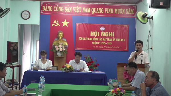 Chiều 29/8, tại Nhà văn hóa ấp Vĩnh An 6 đã diễn ra Hội nghị tổng kết Ban công tác Mặt trận ấp nhiệm kỳ 2024 – 2026. Dự hội nghị có Phó Chủ tịch Ủy ban MTTQ Việt Nam xã Trị An - Nguyễn Hoàng Hà.
