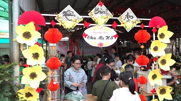 Hội Xuân diễn ra trong không gian ngập tràn sắc màu Tết cổ truyền. Khuôn viên trường rực rỡ cờ hoa, các gian hàng được trang trí đẹp mắt, mang đậm hương vị ngày xuân, tạo nên bầu không khí ấm áp, náo nhiệt.