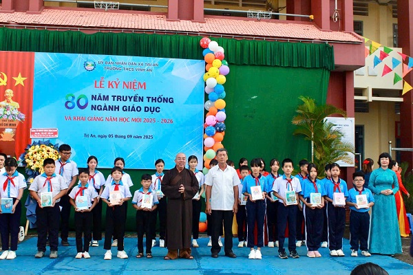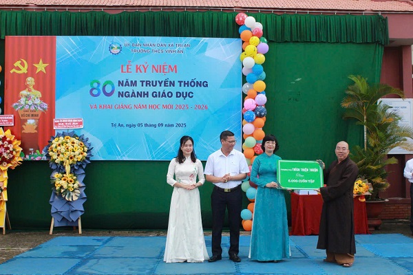 Sáng 5/9, nhân dịp khai giảng năm học mới, Thượng tọa Thích Thiện Thuận, Trụ trì Chùa Phổ Quang (phường Tân Triều), đã trao tặng 6.000 quyển tập cho học sinh xã Trị An.